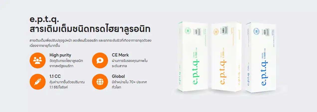 e.p.t.q filler พัทยา ชลบุรี หรือ Epitique Filler คือ ฟิลเลอร์ที่ใช้สำหรับเติมเต็มผิวที่เป็นชนิดกรดไฮยาลูรอนิก (Hyaluronic Acid:HA) เหมาะสำหรับใช้ฉีดเพื่อเติมริ้วรอยร่องลึก ทั้งในผิวชั้นตื้น ชั้นกลางและชั้นลึก ช่วยทำให้ริ้วรอยบนใบหน้าดูจางลงได้อย่างรวดเร็ว