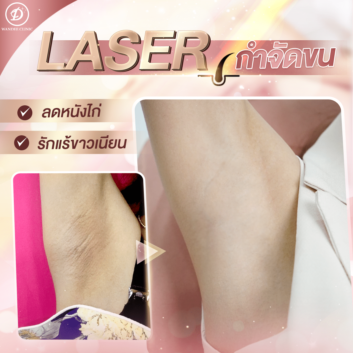 - เลเซอร์รักแร้ พัทยา ช่วยลดขนคุด รักแร้หนังไก่ ปรับผิวใต้วงแขนให้เรียบเนียน กระจ่างใส ใส่เสื้อแขนกุดได้อย่างมั่นใจไร้กังวล